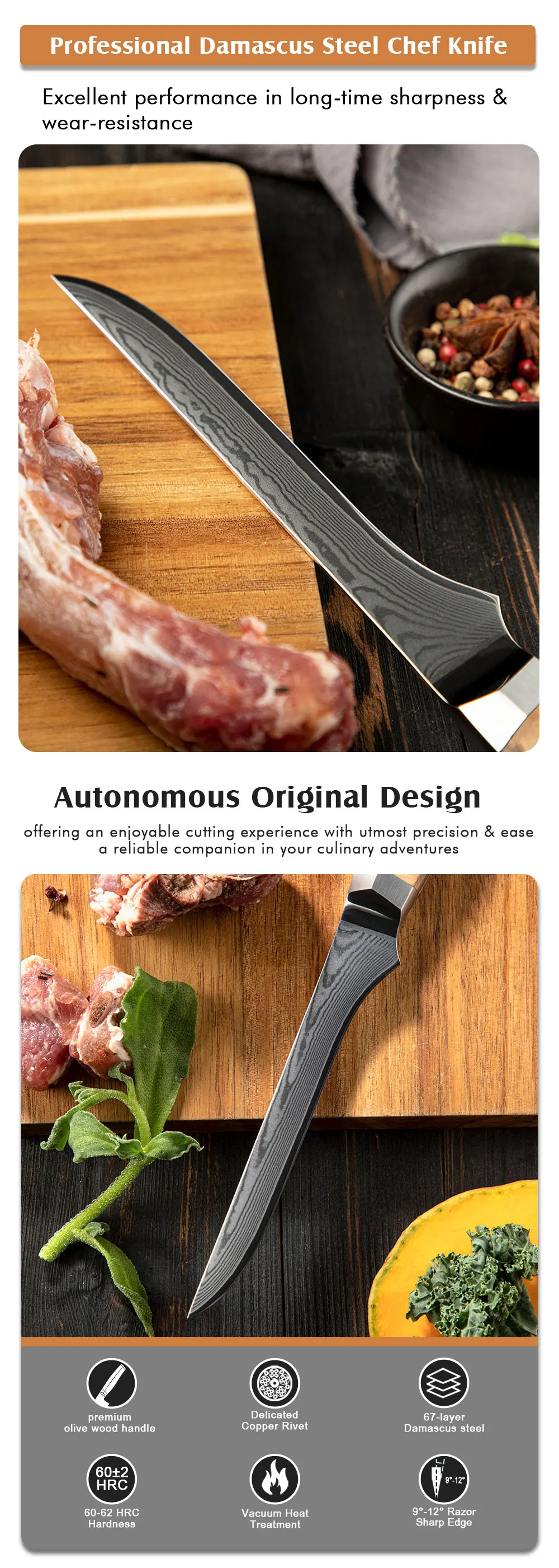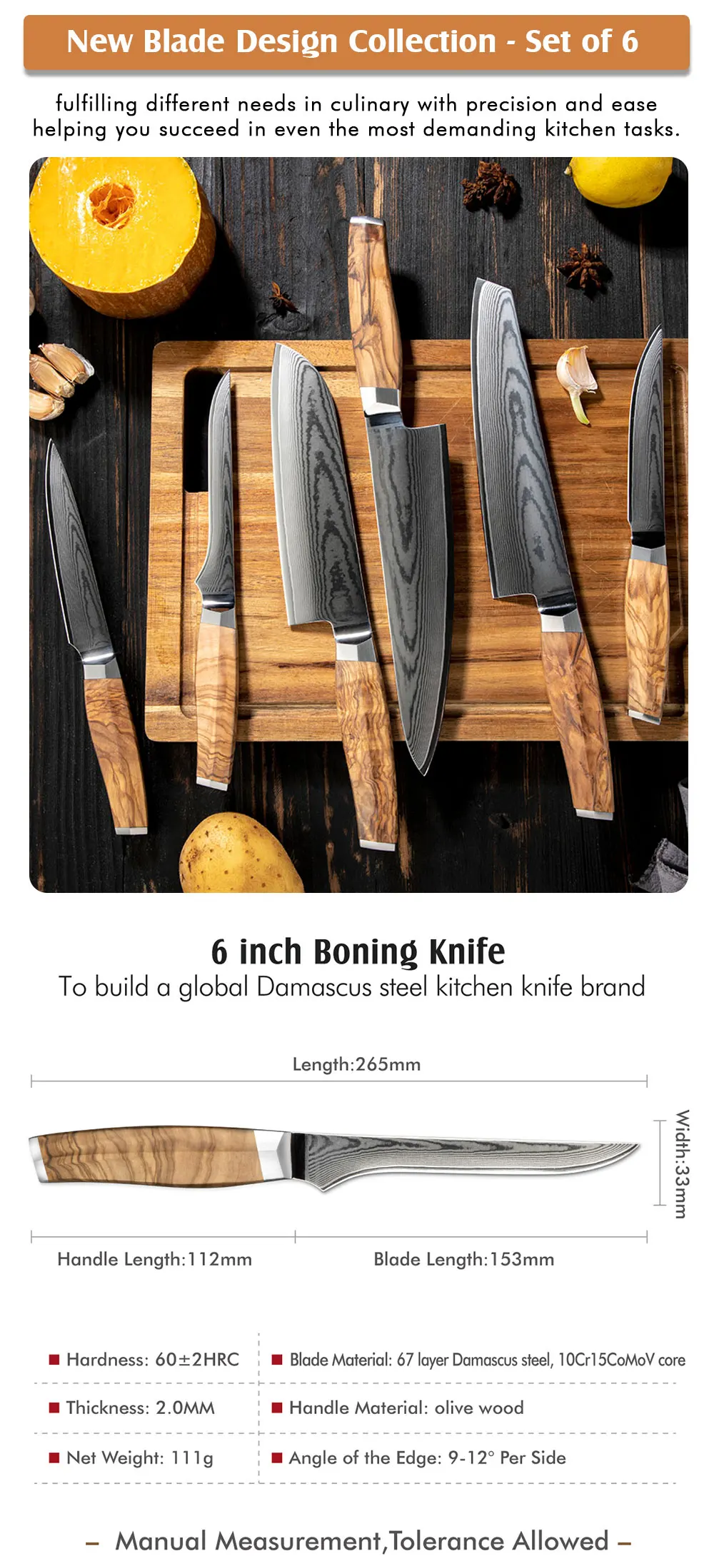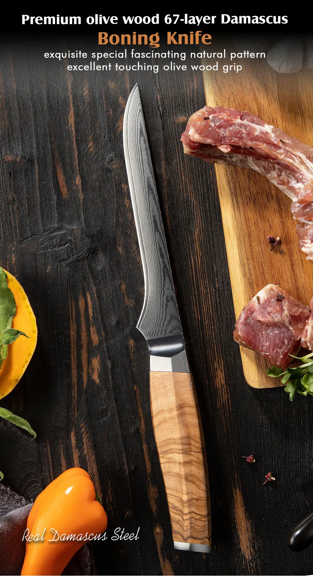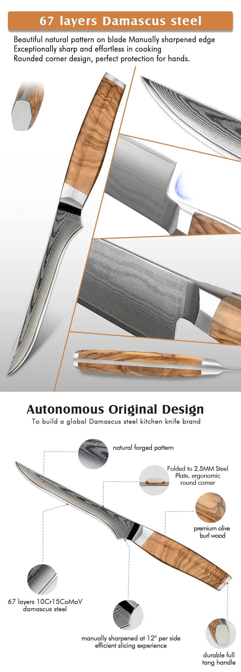 Amber Olive Wood Handle 6inch Professional Damascus Vg10 Kitchen Fish Knife Fillet Knife Boning Knife