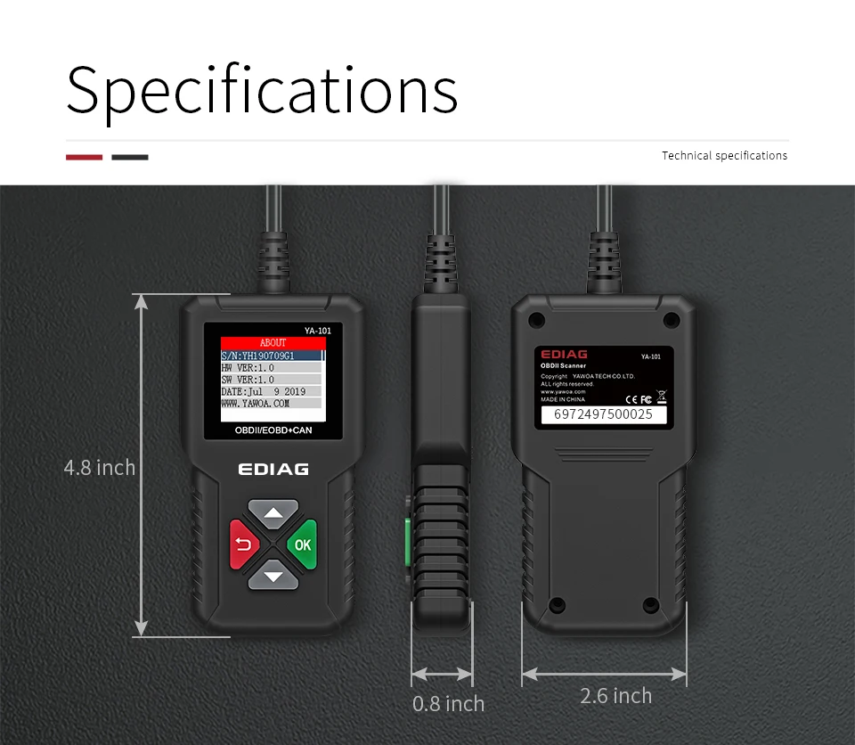 YA-101 is an upgraded version of basic obd2 scanners with feature complete support of all 10 modes of obd2; including reading and erasure of current codes, O2 Sensor Tests, On-Board Monitor Test (Mode 6), EVAP System Test (Mode 8), I/M Readiness, Vehicle Info, etc,.Help you pass the Smog check!