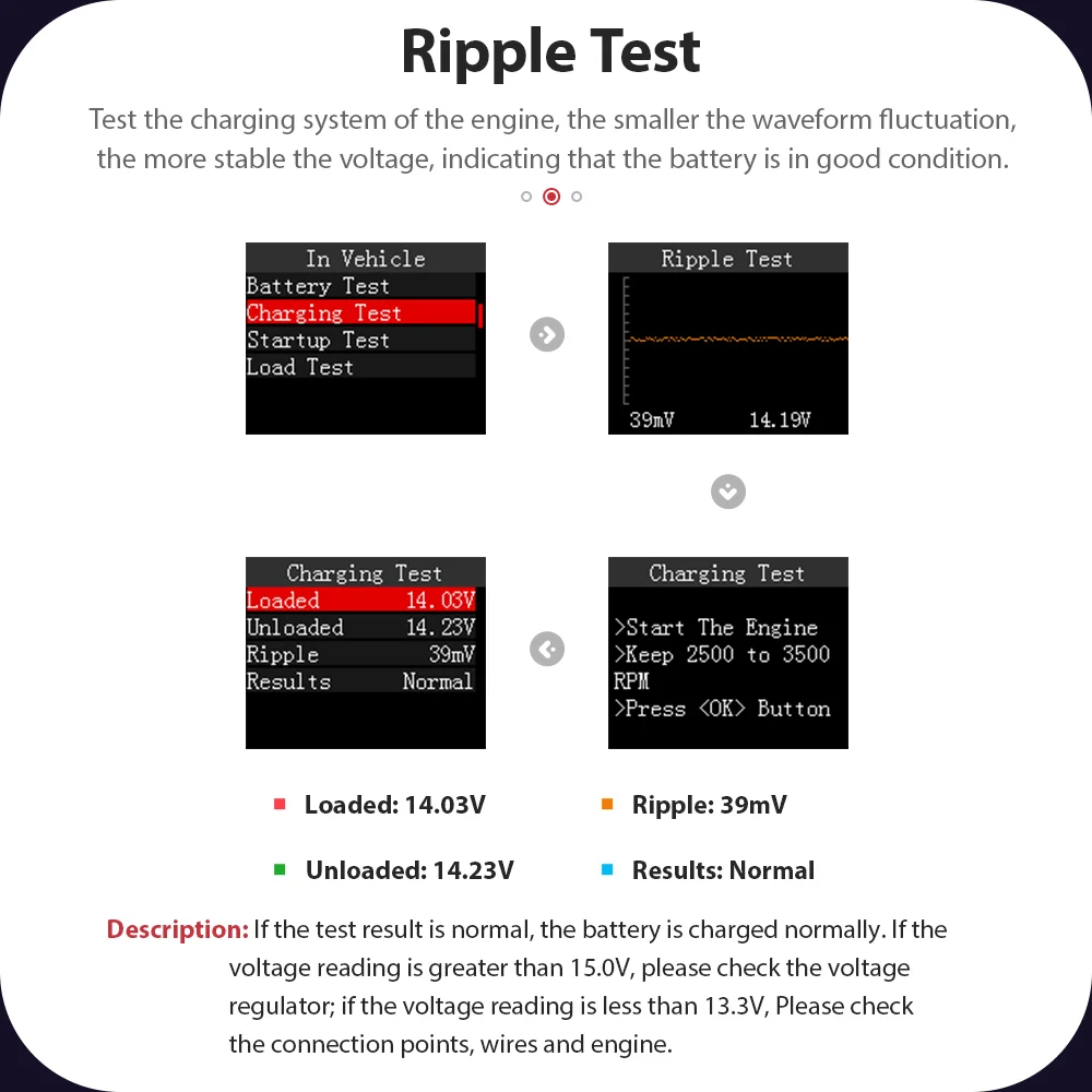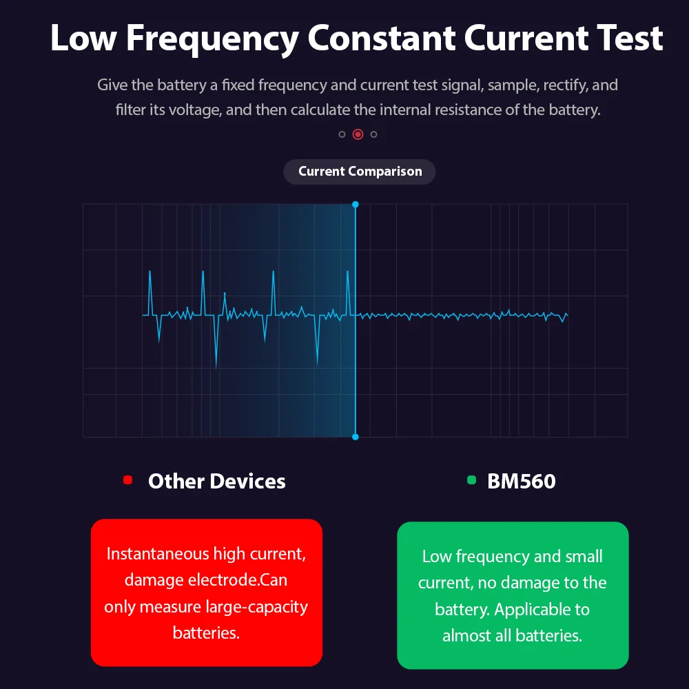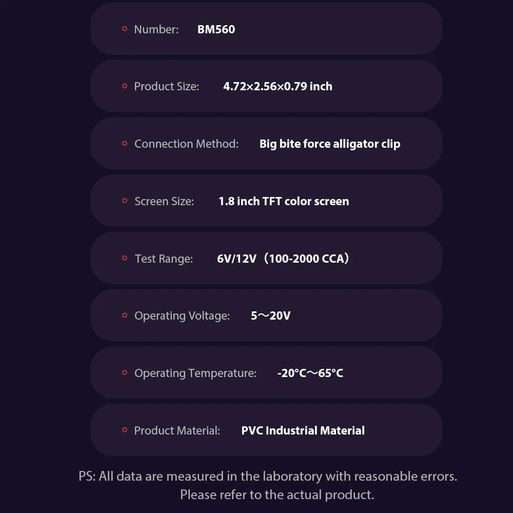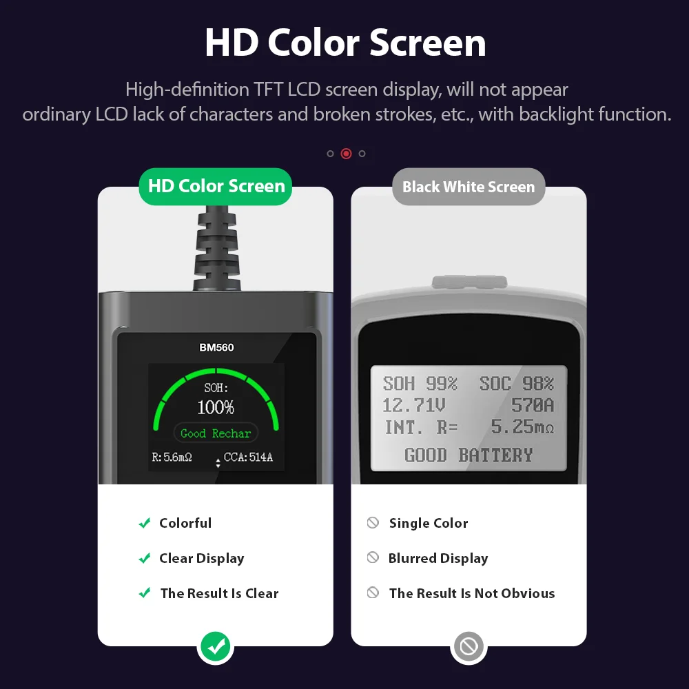 BM560 with 1.8 inch TFT color screen, which is mainly targeted to analyze the battery healthy status to calculate the actual cold cranking, capability of the battery and the aging extent, which provide reliable analysis evidence for the test and maintenance of the battery.