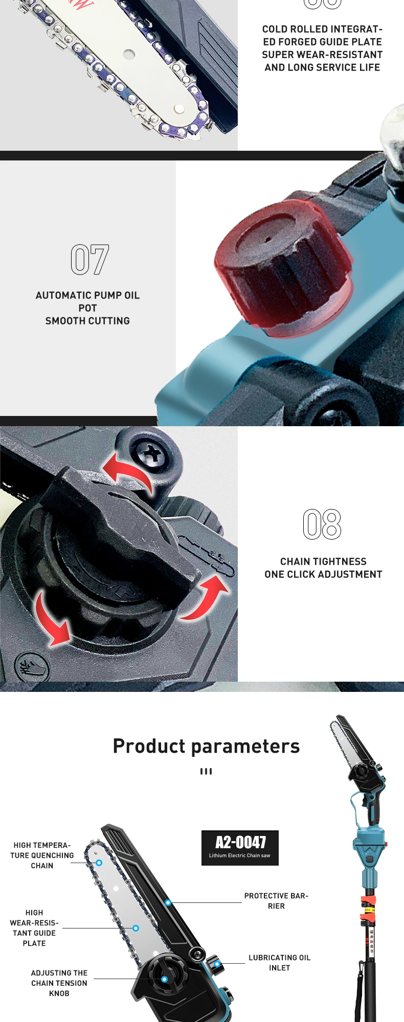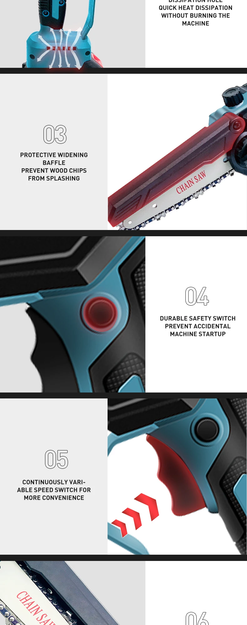 4.2) when there is dust and dirt inside or outside the power tool, please wipe it with a little alcohol, but avoid a large amount of alcohol or moisture penetrating into the bearing. The inside of the chain saw can not be fill water (the bearing will rust and damage)
