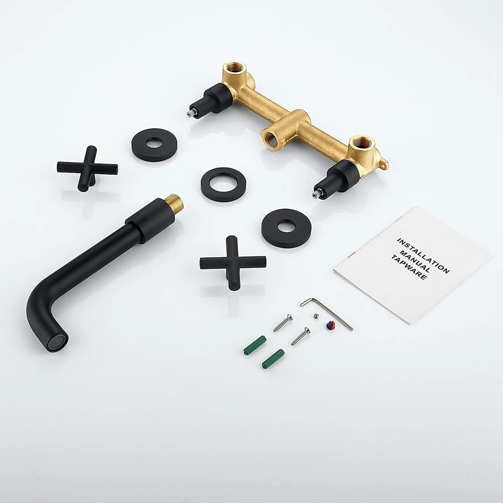 Modern 3 Hole Wall Mounted Hot Cold Water Tap Matt Black Finish Brass 2 Handle In-wall Wash Basin Mixer