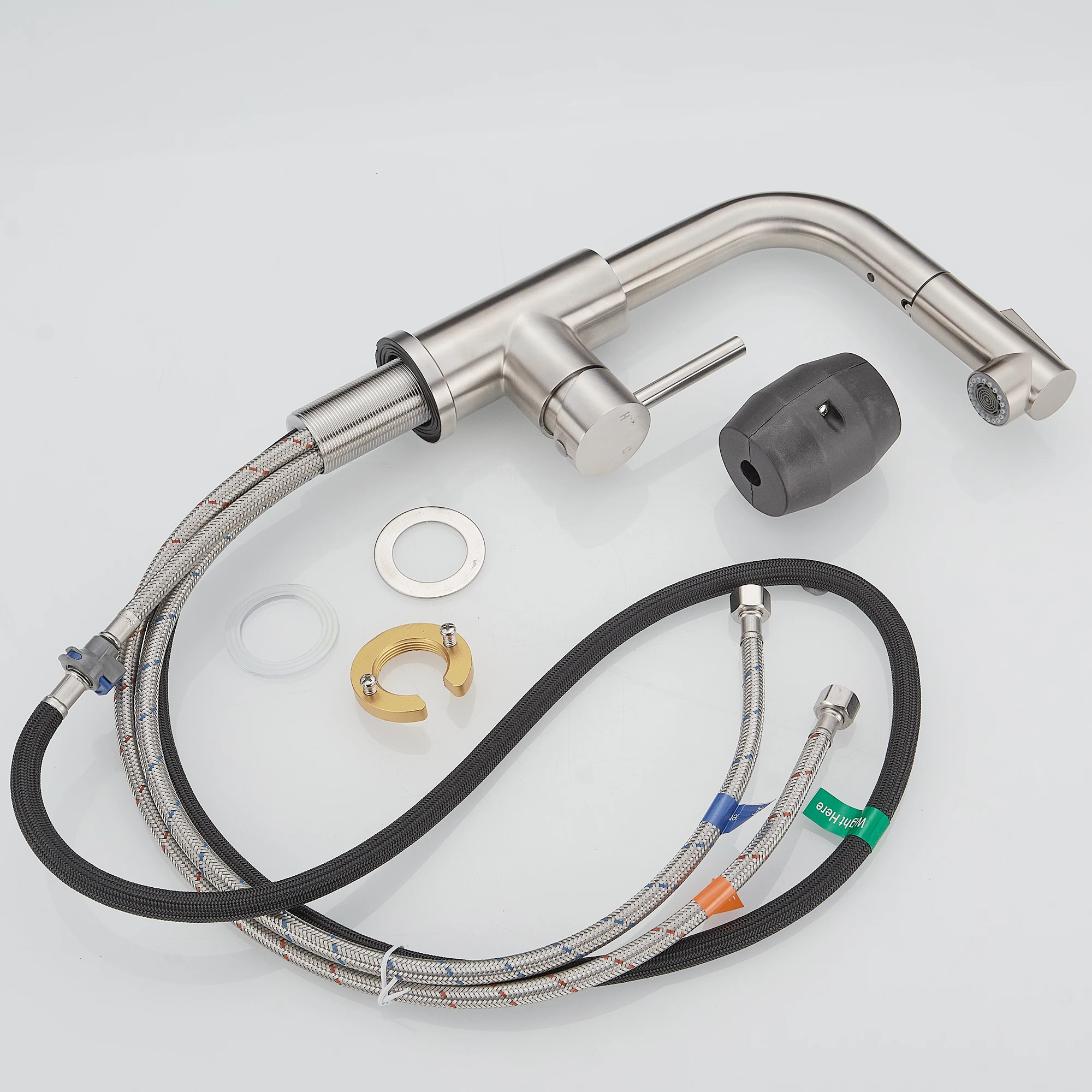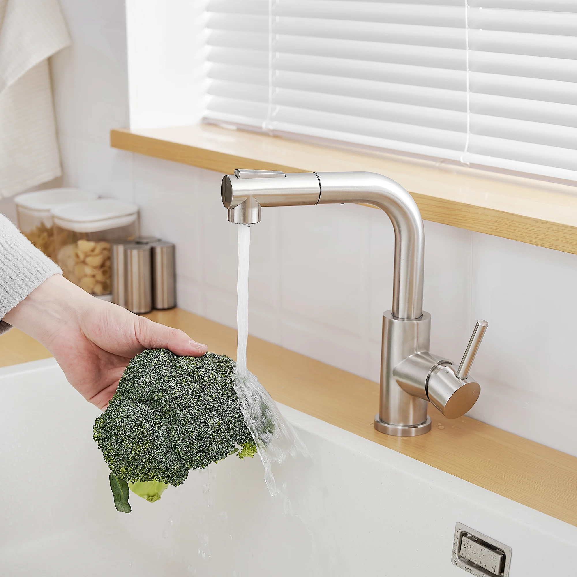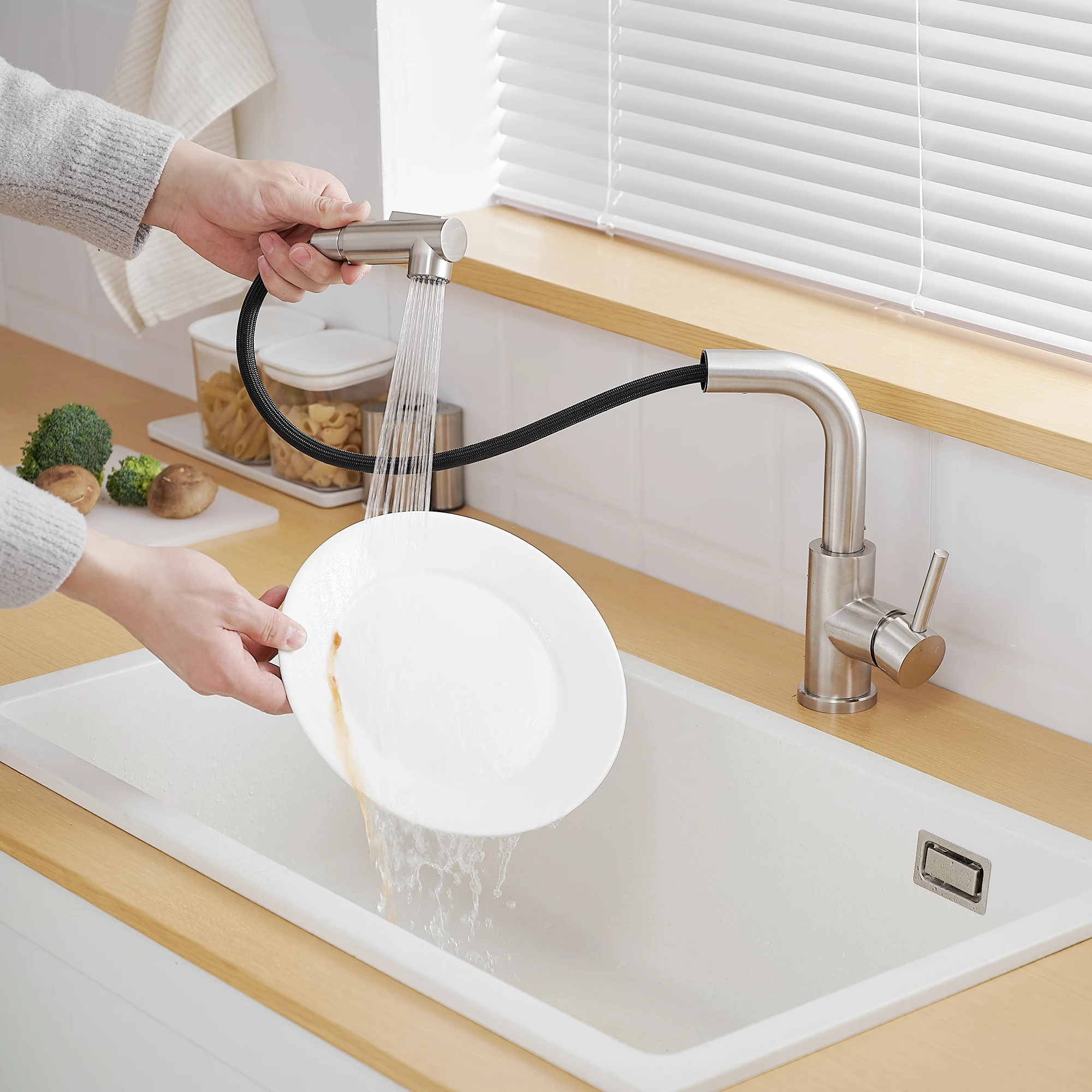 Modern Single Handle Pull Stainless Steel Kitchen Sink Faucet Brushed Nickel Sprayer Classic Style Hot Cold Water Single Hole