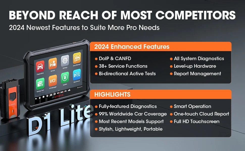 OTOFIX D1 Lite is such a powerful diagnostic tool that you'll never have to wonder what check engine light means. It enables you to have the ability to run full systems diagnoses, comprehensive service functions, OE-level diagnoses and diagnostic trouble code (DTC) analyses.OTOFIX D1 Lite, an advanced intelligent automotive diagnostic analyzer, is built to take your diagnostic experience to a whole new level, featuring up to 26 service functions. It provides one-stop solutions when paired with the OTOFIX cloud-based app on your phone or tablet.Moreover, with the power of OTOFIX cloud services behind it, the D1 Lite will keep you on top of all the latest problems and fixes for an extensive variety of popular vehicle makes and models. Put the power of a professional garage in your hand with the OTOFIX D1 Lite.