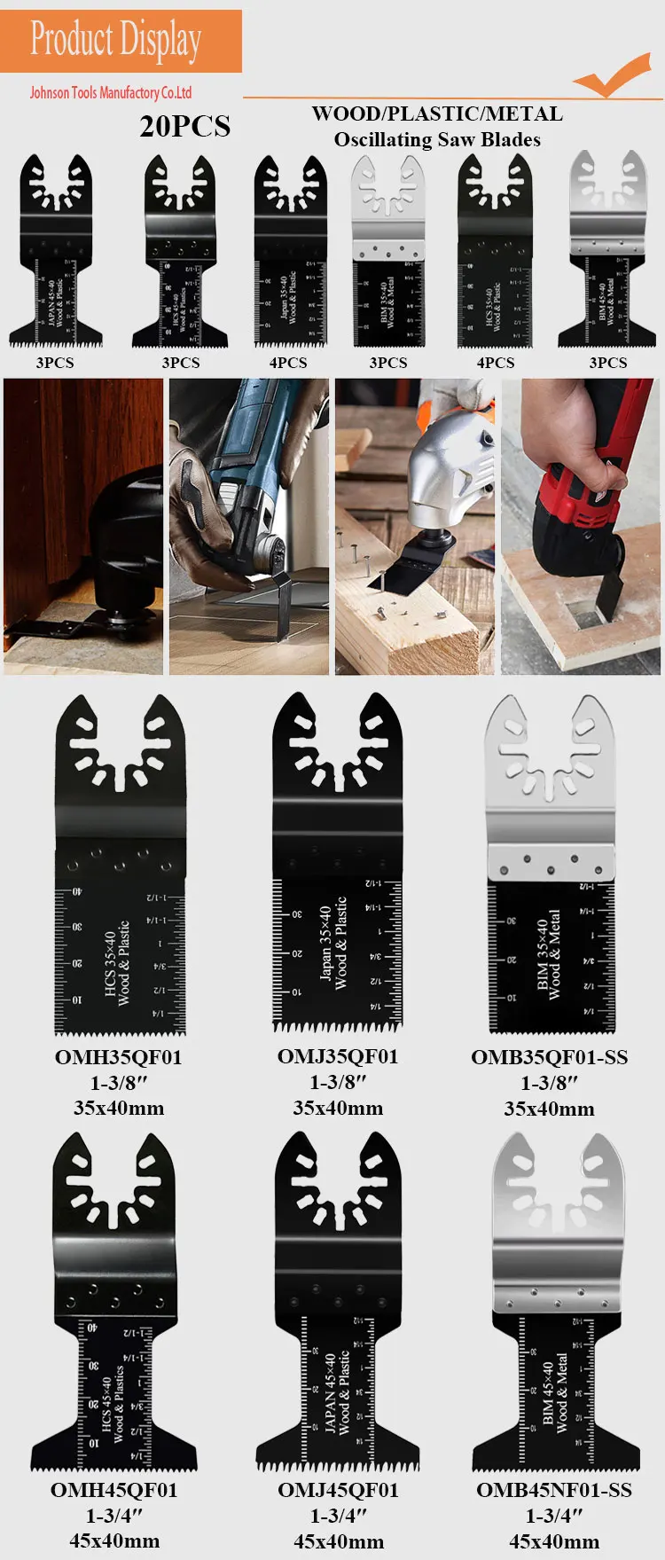 Description This sets contains blades as below: (total 20pcs) 3 pcs - 1-3/4-Inch Wood/Soft-Metal Oscillating saw blades. 3 pcs - 1-3/4-Inch Precision Japan Tooth Oscillating saw blades. 3 pcs - 1-3/4-Inch Bi-Metal Oscillating saw blades. 4 pcs - 1-3/8-Inch Wood/Soft-Metal Oscillating saw blades. 4 pcs - 1-3/8-Inch Precision Japan Tooth Oscillating saw blades. 3 pcs - 1-3/8-Inch Bi-Metal Oscillating saw blades.