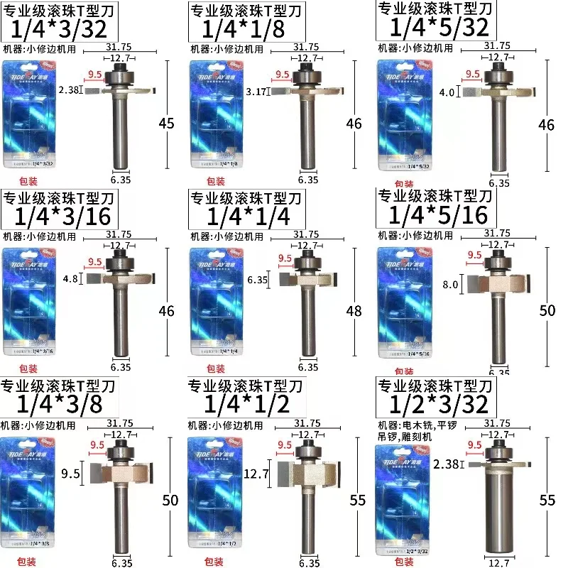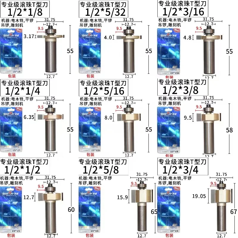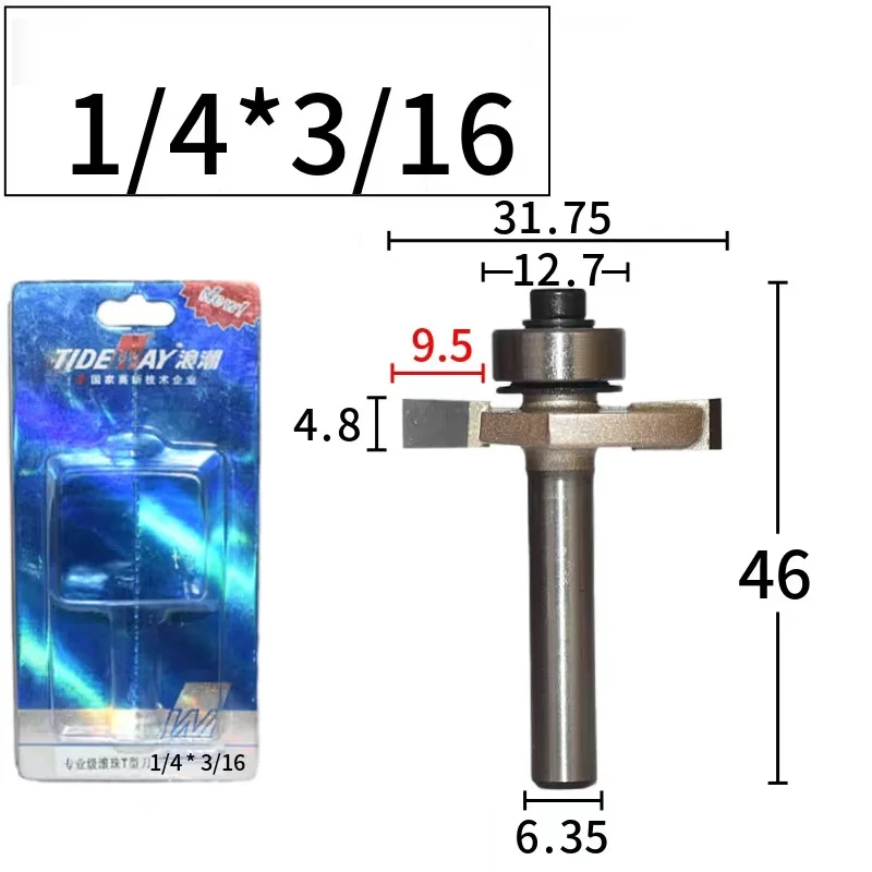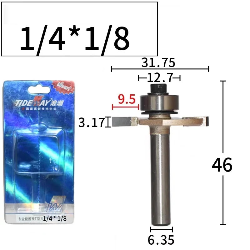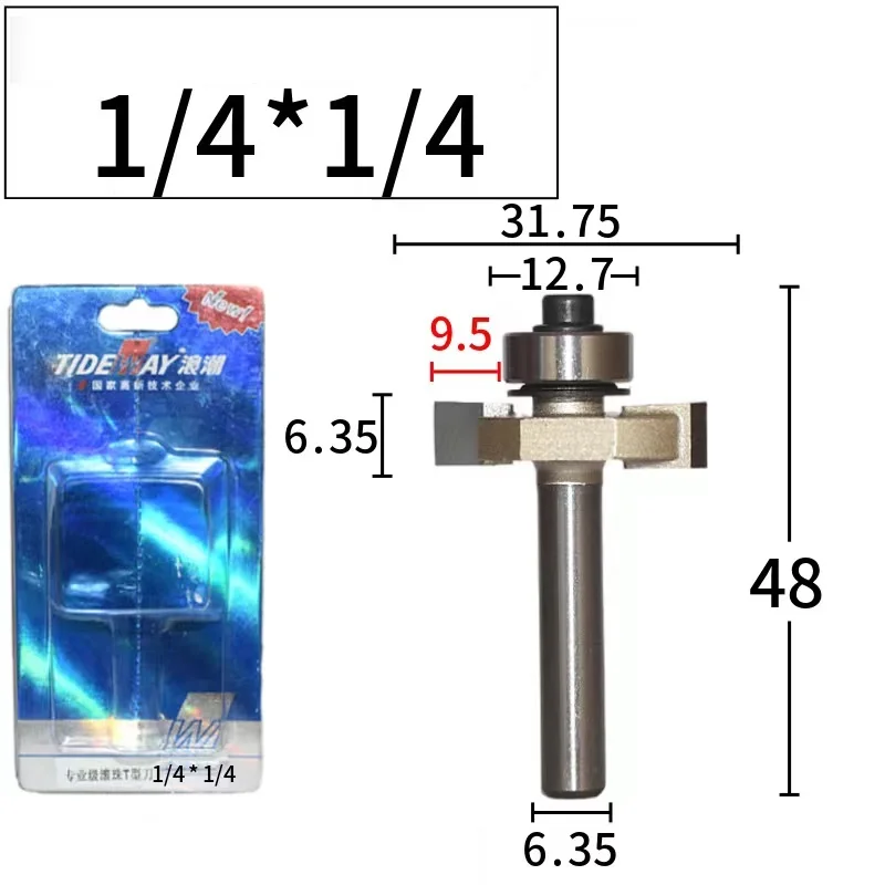 Tideway Professional Grade T Type Slotting Milling Cutter with Bearing for Wood CNC Milling Tool, diameter - shank*blade thickness